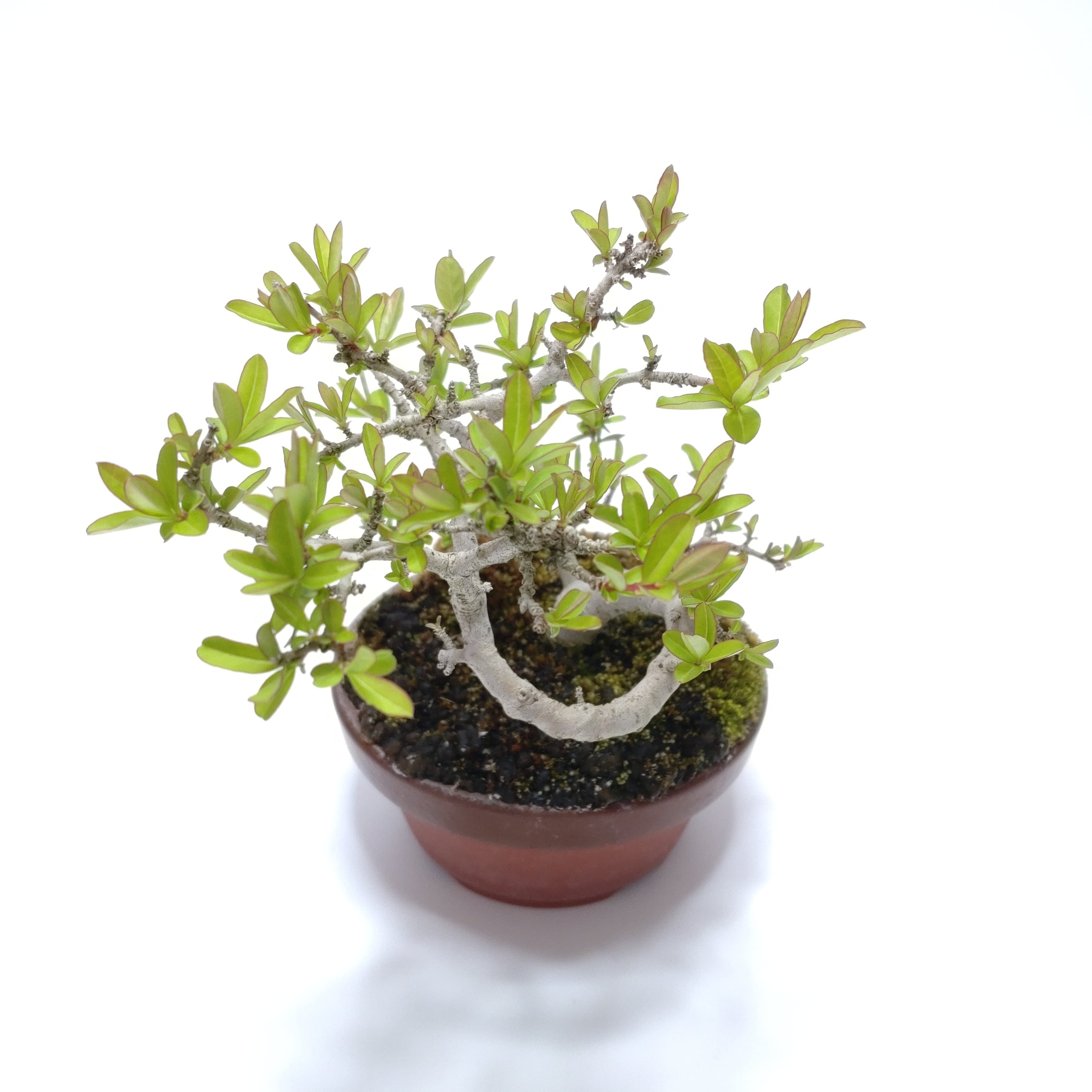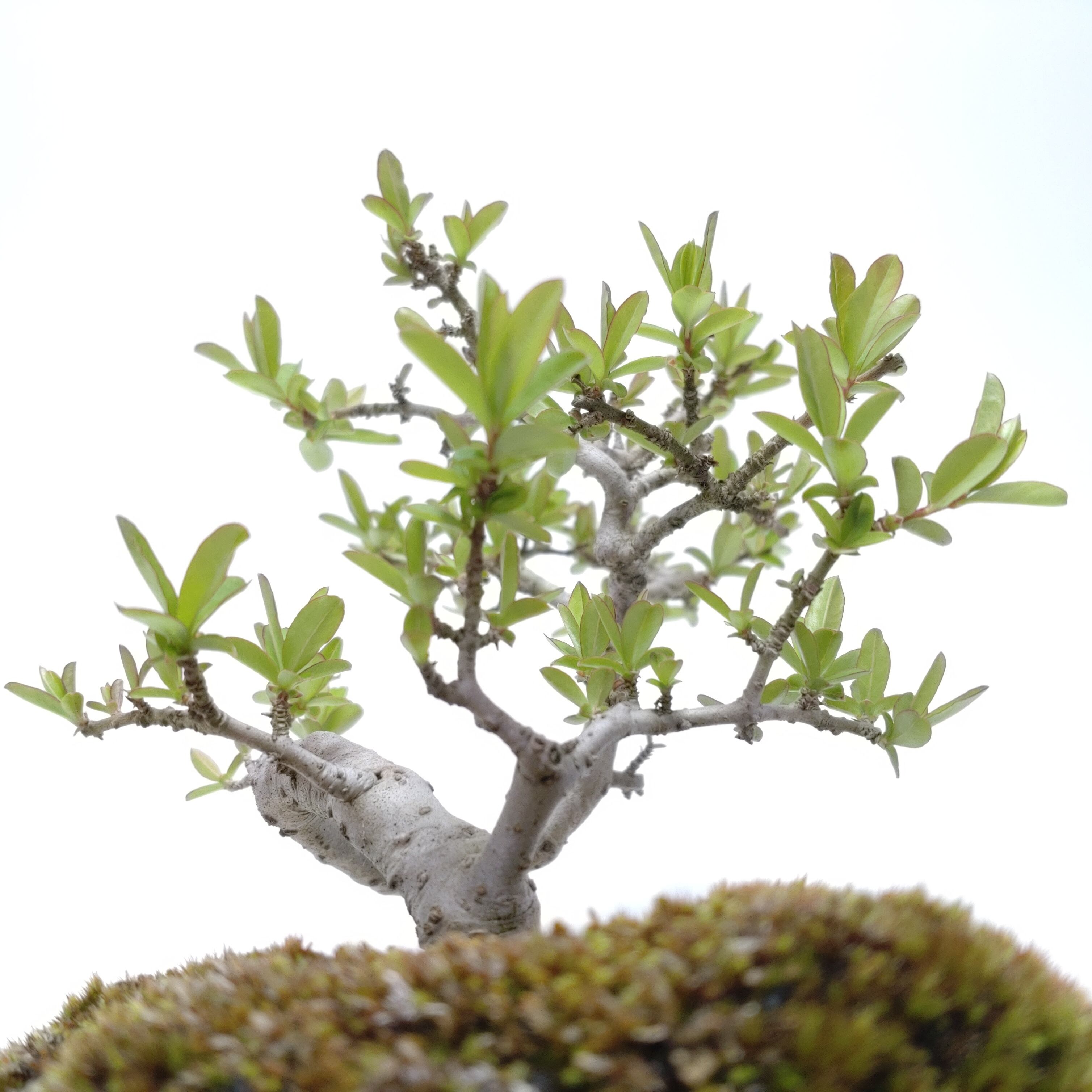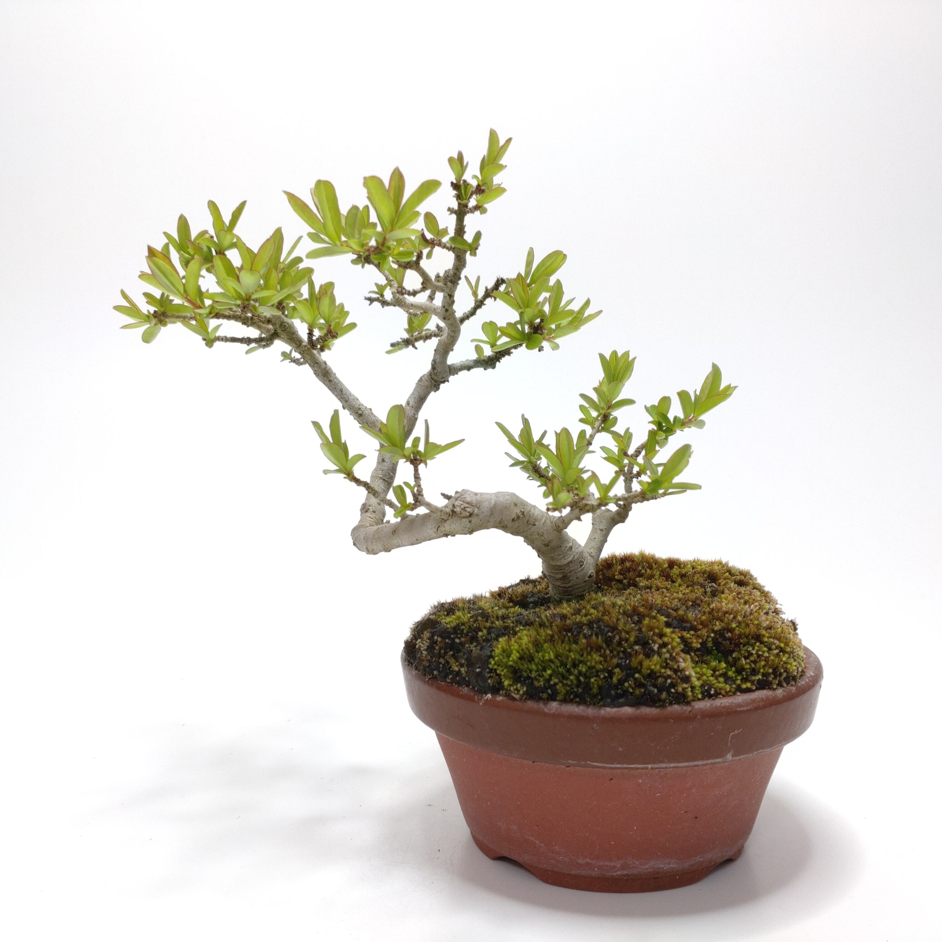 生長が早く、早い時期に幹がはぜて、古色感が出てきます。細かく繊細な枝が魅力で、葉刈りをこまめにすると、よく分枝して密になります。白い小花の房や、紫黒色に色づく実も、渋い味わいです。盆栽では、冬期の寒樹姿が人気です。
