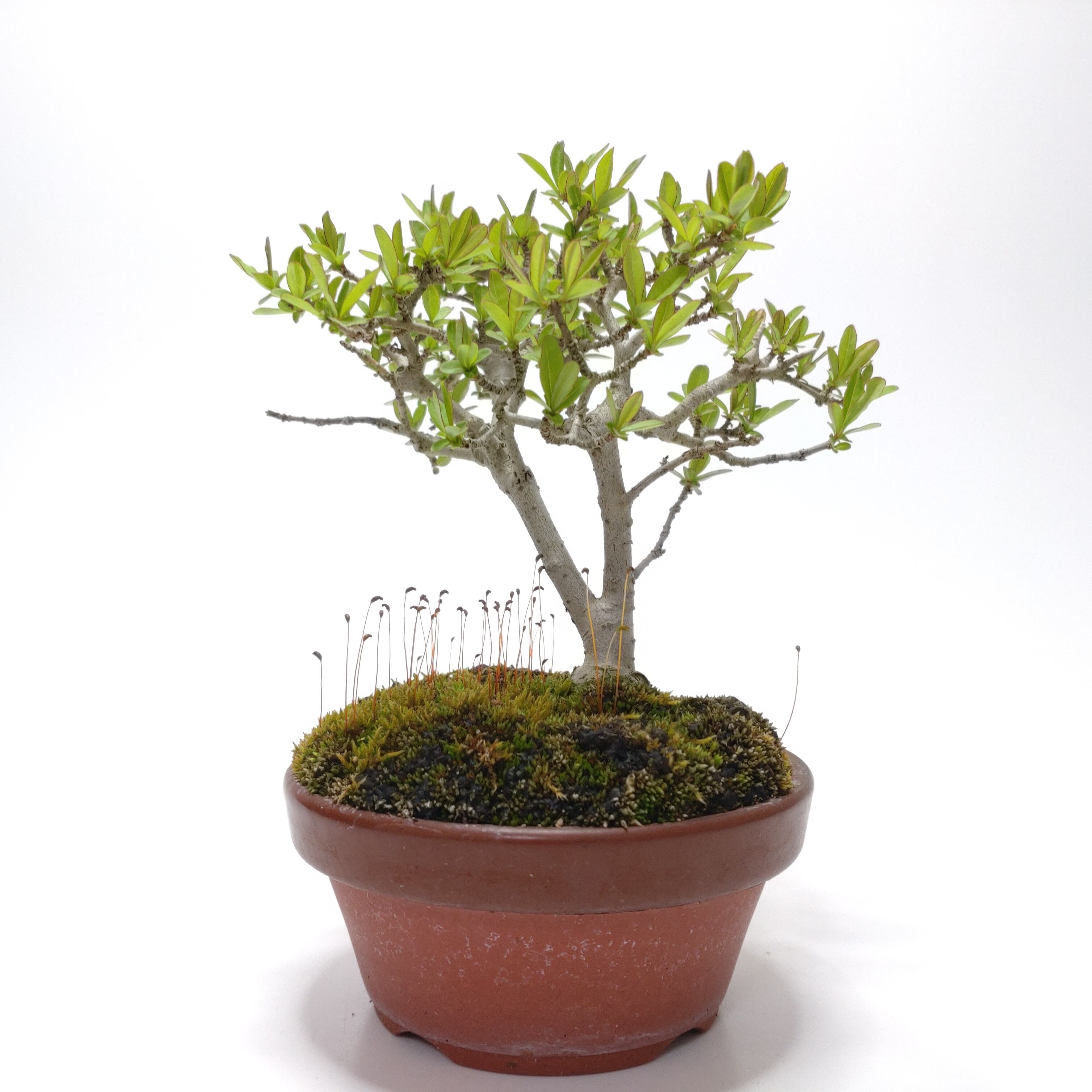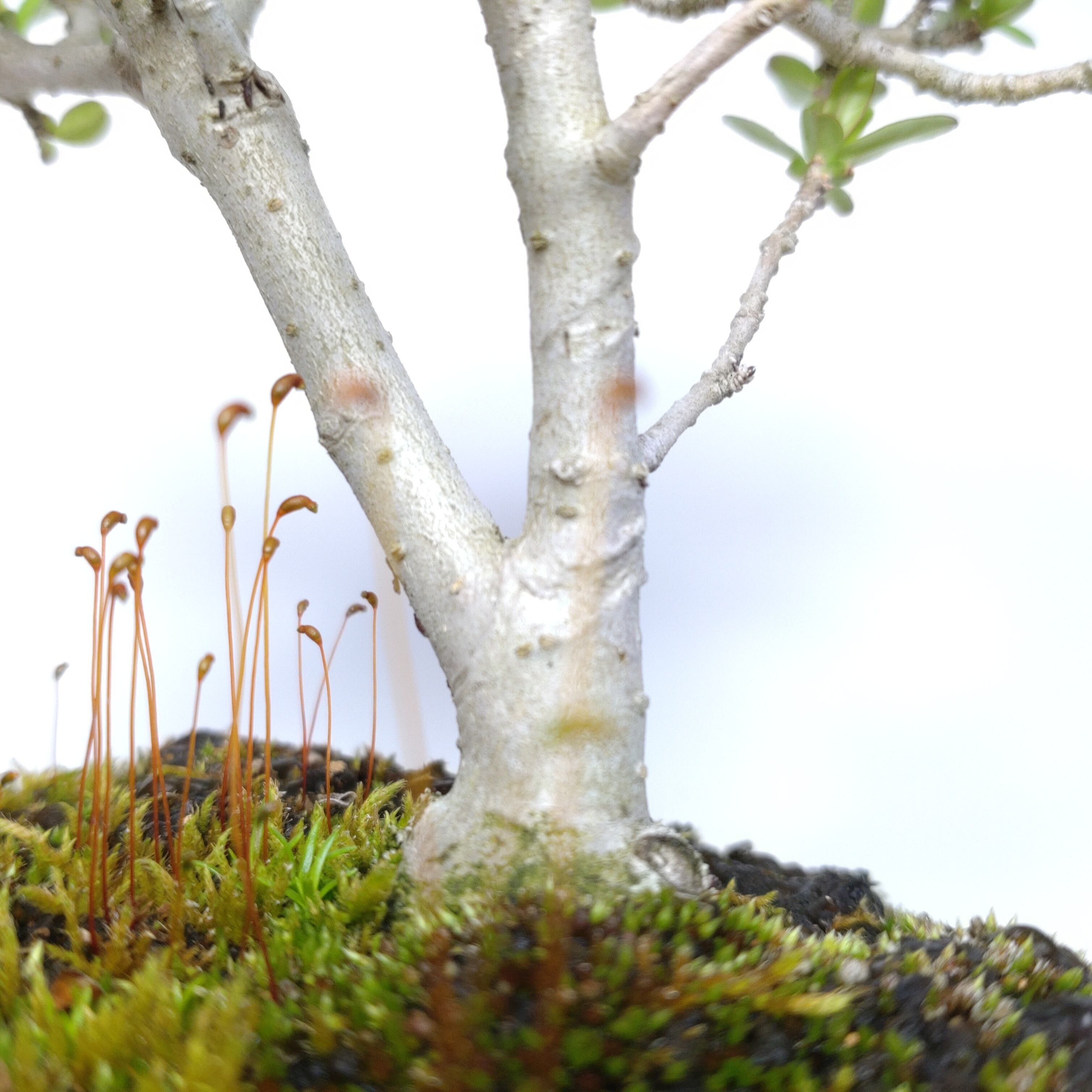 生長が早く、早い時期に幹がはぜて、古色感が出てきます。細かく繊細な枝が魅力で、葉刈りをこまめにすると、よく分枝して密になります。白い小花の房や、紫黒色に色づく実も、渋い味わいです。盆栽では、冬期の寒樹姿が人気です。