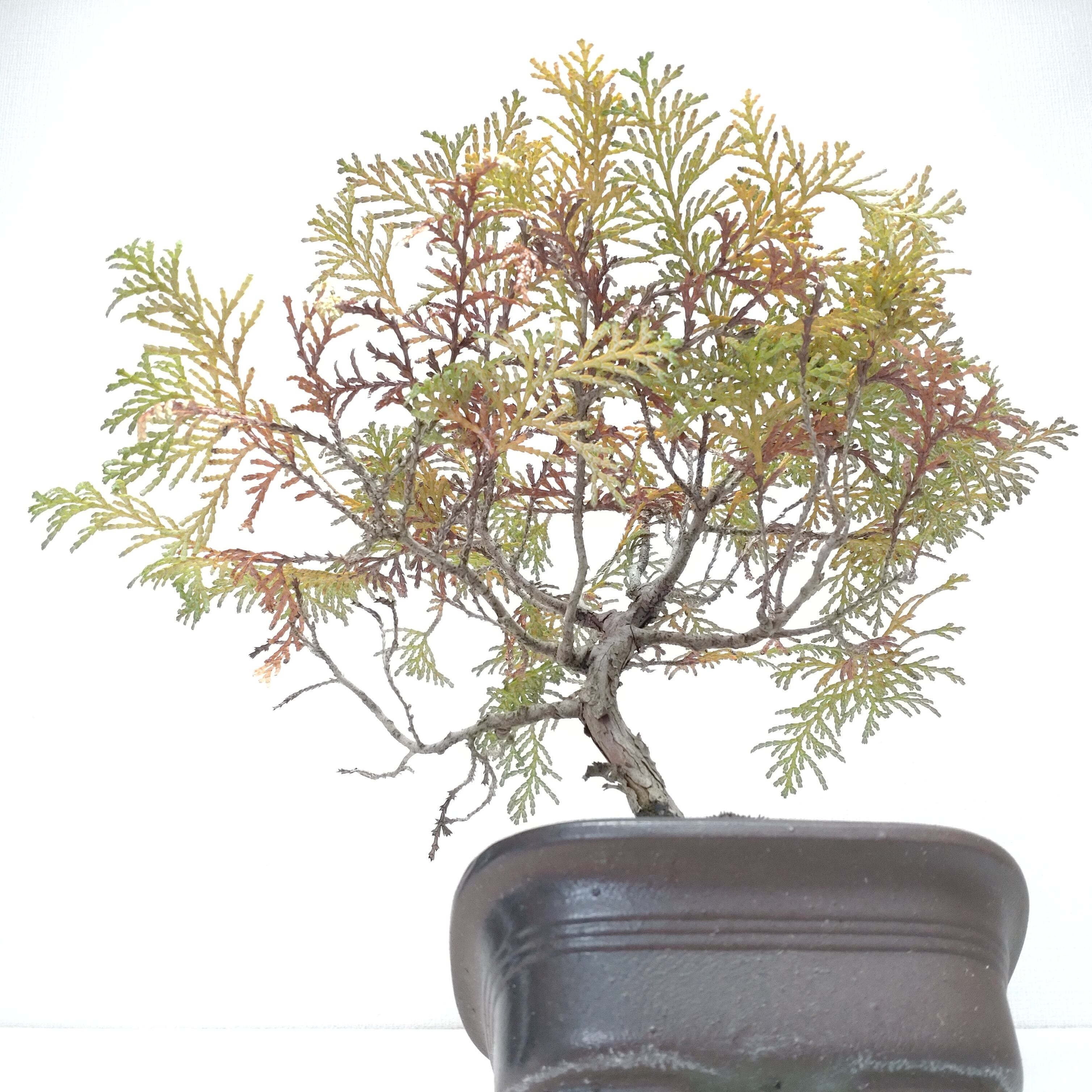 古くなると幹肌が割れ、味わいが増します。冬焼けした茶褐色の葉色も風情があります。また、ヒノキの成分が持つ抗菌作用、防虫効果、消臭効果、リラックス効果があり、一鉢そばに置いてみてはいかがでしょうか。
